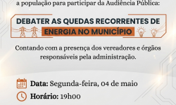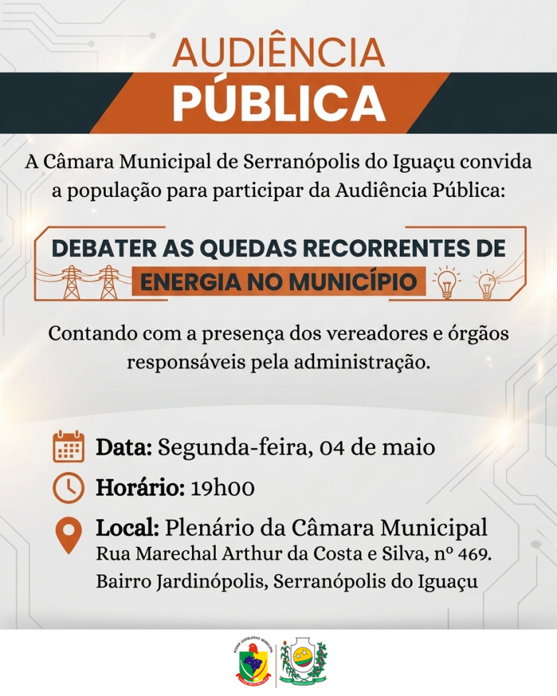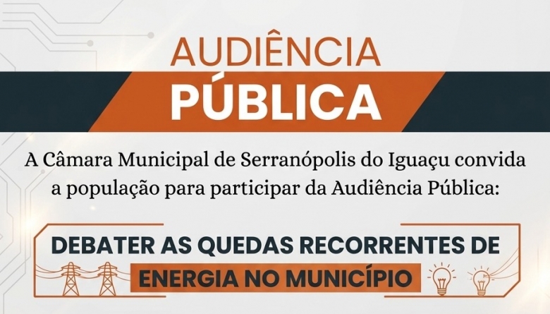 Convocar a população, entidades civis públicas e privadas de Serranópolis do Iguaçu, para prestigiarem a Audiência Pública para debater os recorrentes problemas de queda e oscilação de energia elétrica que afeta o Município de Serranópolis do Iguaçu, que será realizada:
