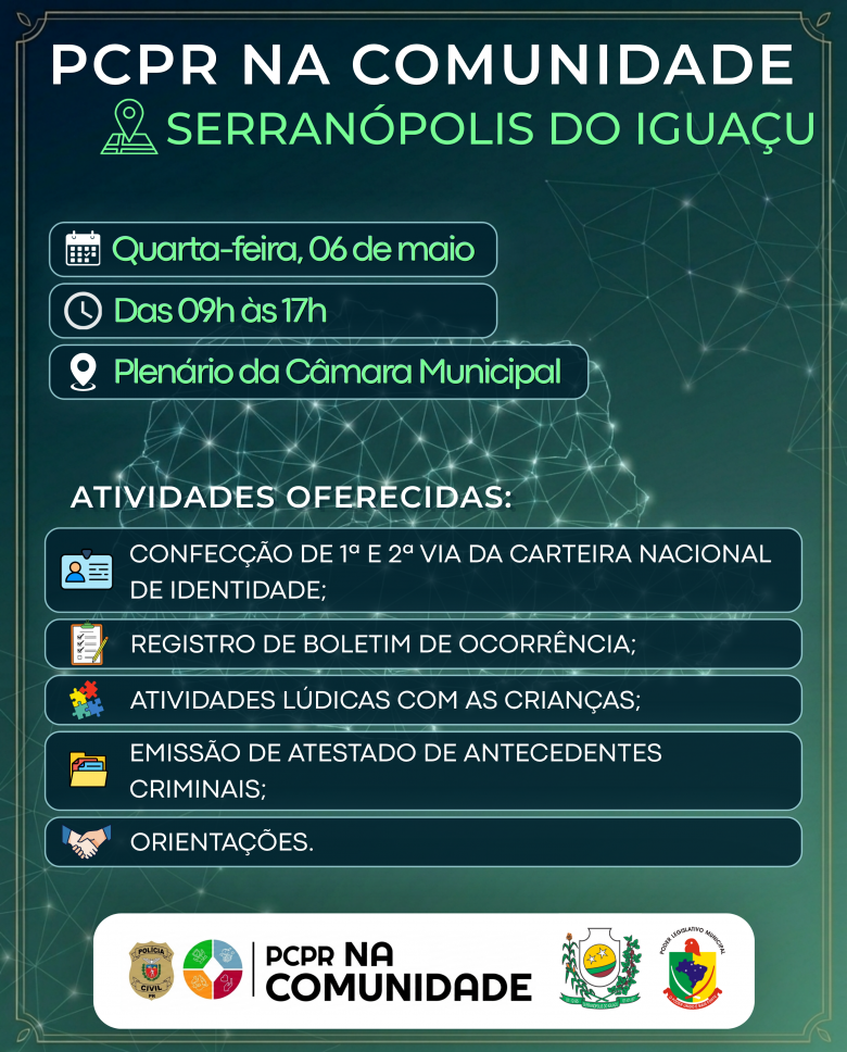 A Câmara Municipal de Serranópolis do Iguaçu convida, no dia 6 de maio, a população Serranópolis do Iguaçu para participar do programa Polícia Civil na Comunidade do estado do Paraná (PCPR).